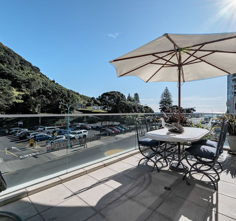 This stunning two-bedroom apartment on level two offers the ultimate beachside lifestyle, with views of Mount Maunganui Beach to the right, Pilot Bay to the left and Mount Maunganui itself positioned front and centre.